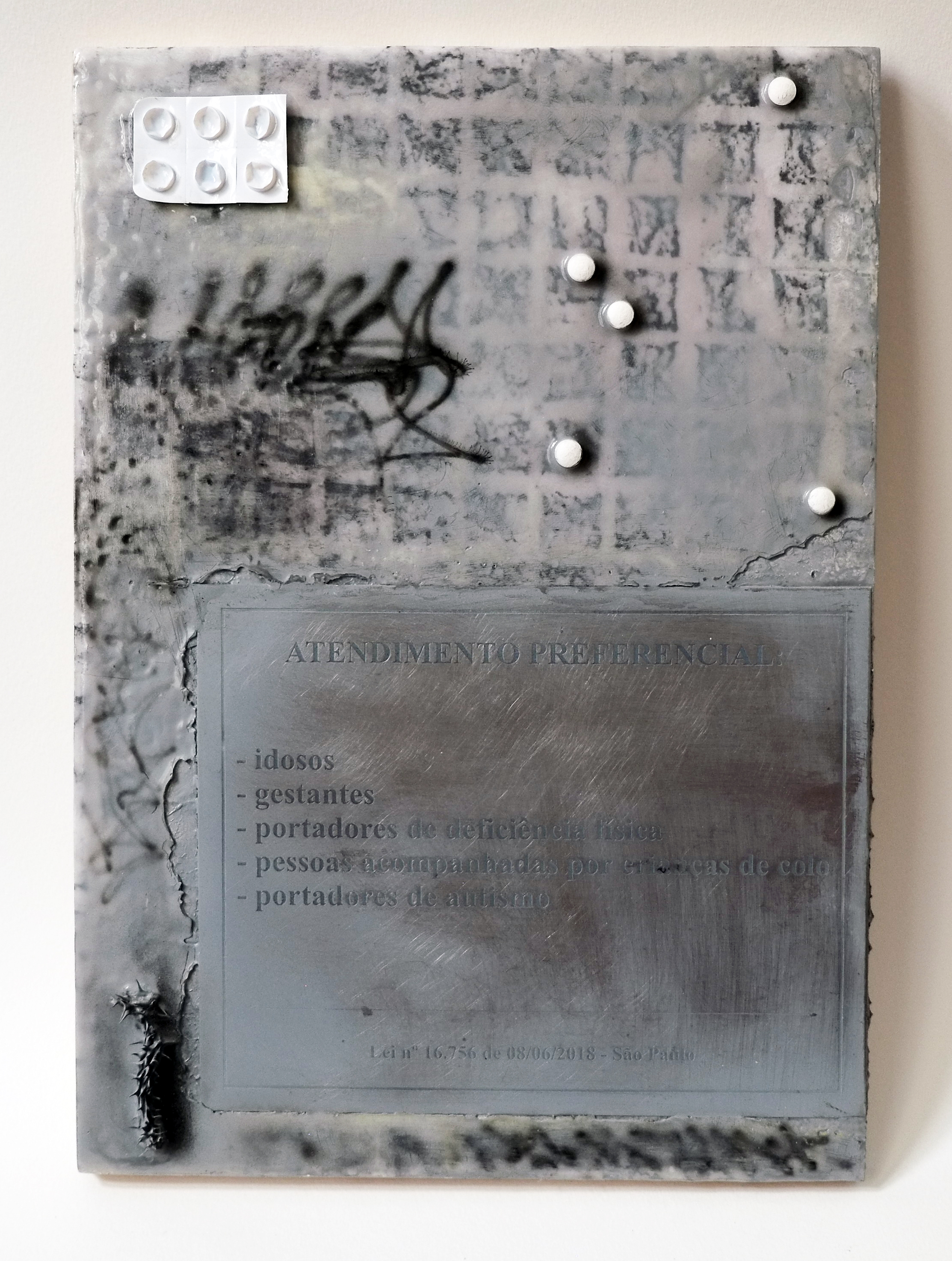 Relief - pencil on paper, plastic bag, stickers, metal net, resin on wooden panel, 60x40; 2023